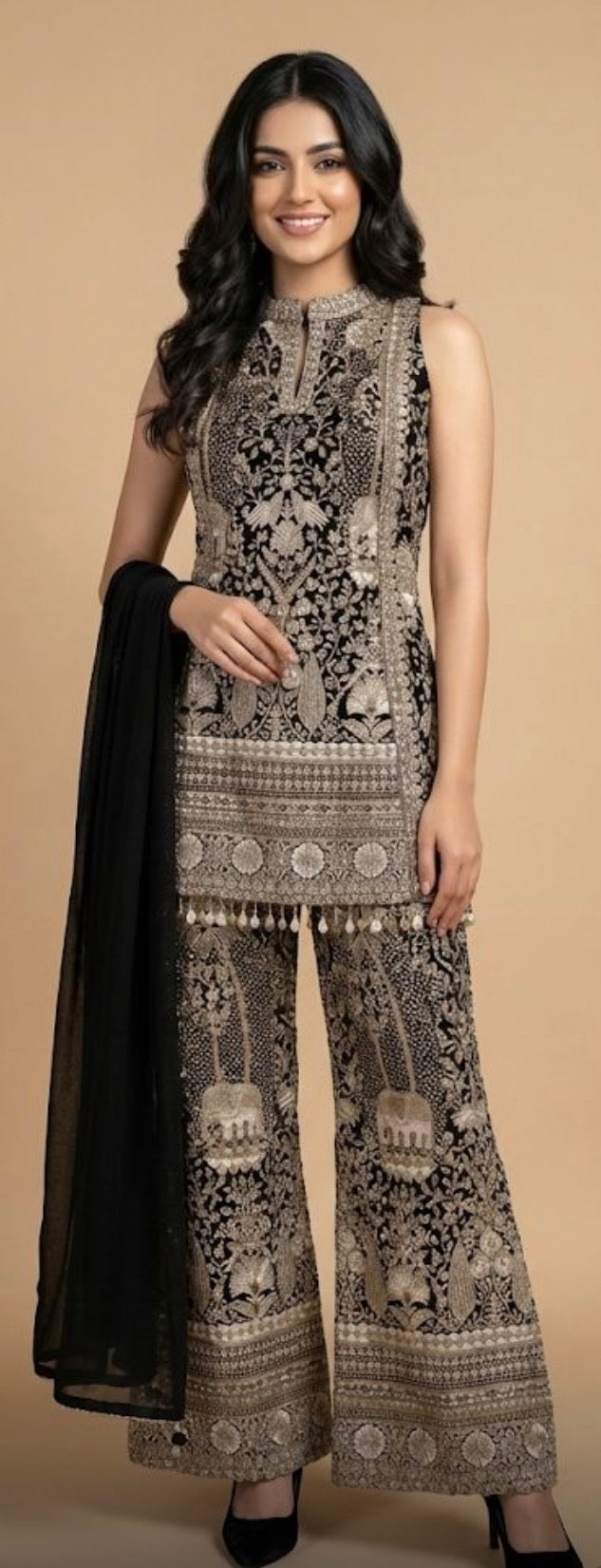 Black and beige thread embroidery with gold sequins short concept top. Shell tassels at bottom and side of top. Fully embroidered flared pants. Pleated dupatta with embroidered patch.